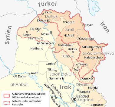 La zona foderata di rosso è la regione curda autonoma in Iraq accettata dalla costituzione irachena. La linea tratteggiata rossa è l'area aggiuntiva che i Kurdi hanno catturato e talvolta controllati.