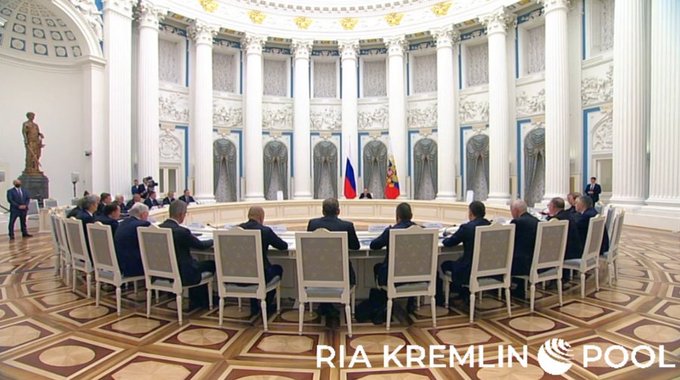 Inoltre, il presidente russo Vladimir Putin sta tenendo un incontro con TUTTO il “Complesso militare-industriale” russo nella Sala di Caterina la Grande, all’interno del Cremlino, come si vede nella foto qui sotto: