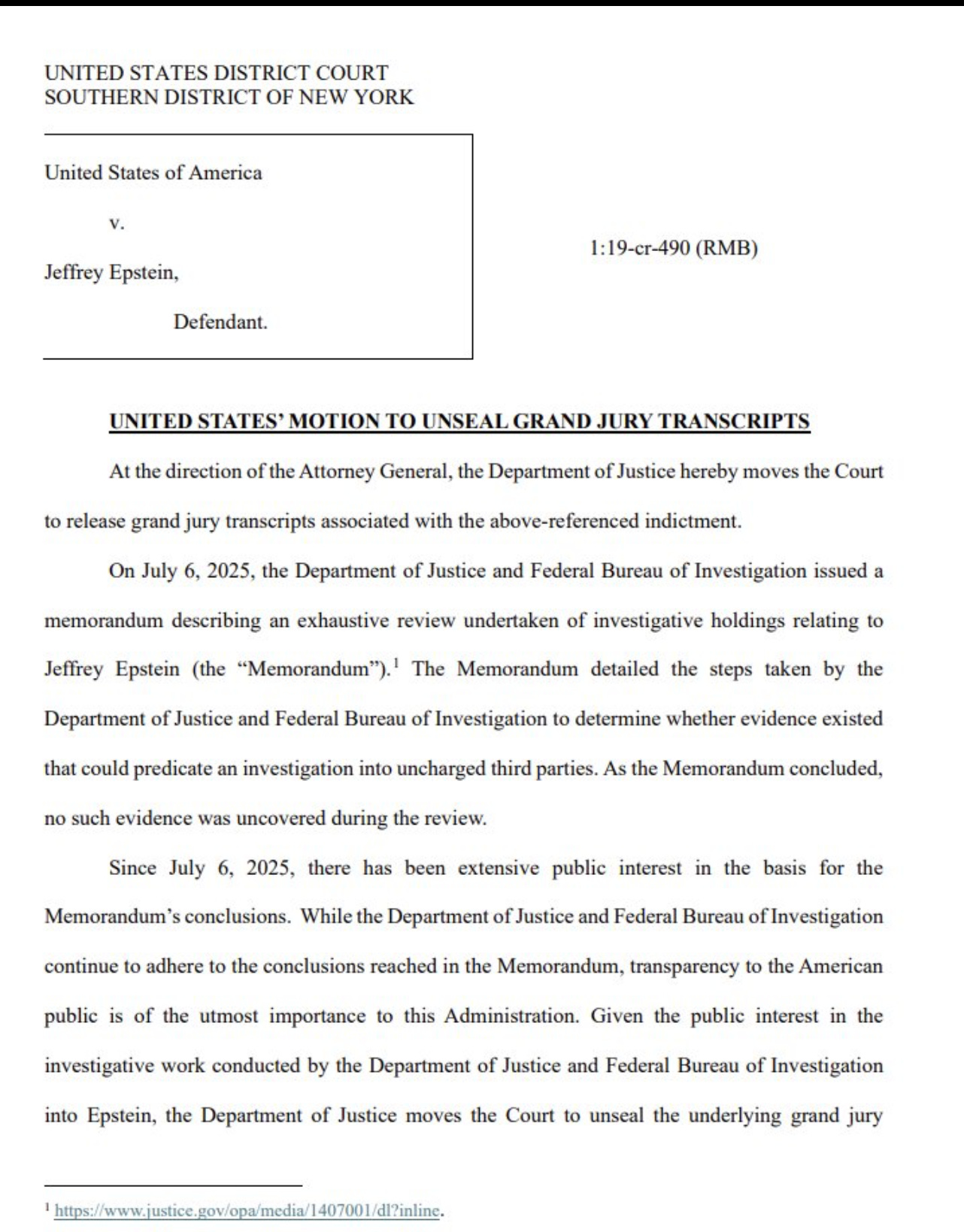 Amministrazione Trump: "Dato l'interesse pubblico per il lavoro investigativo condotto dal Dipartimento di Giustizia e dall'FBI su Epstein, il Dipartimento di Giustizia chiede alla Corte di desecretare le trascrizioni della giuria nel caso Stati Uniti contro Epstein, a condizione che vengano opportunamente eliminate le informazioni relative alla vittima e altre informazioni identificative personali", hanno affermato...