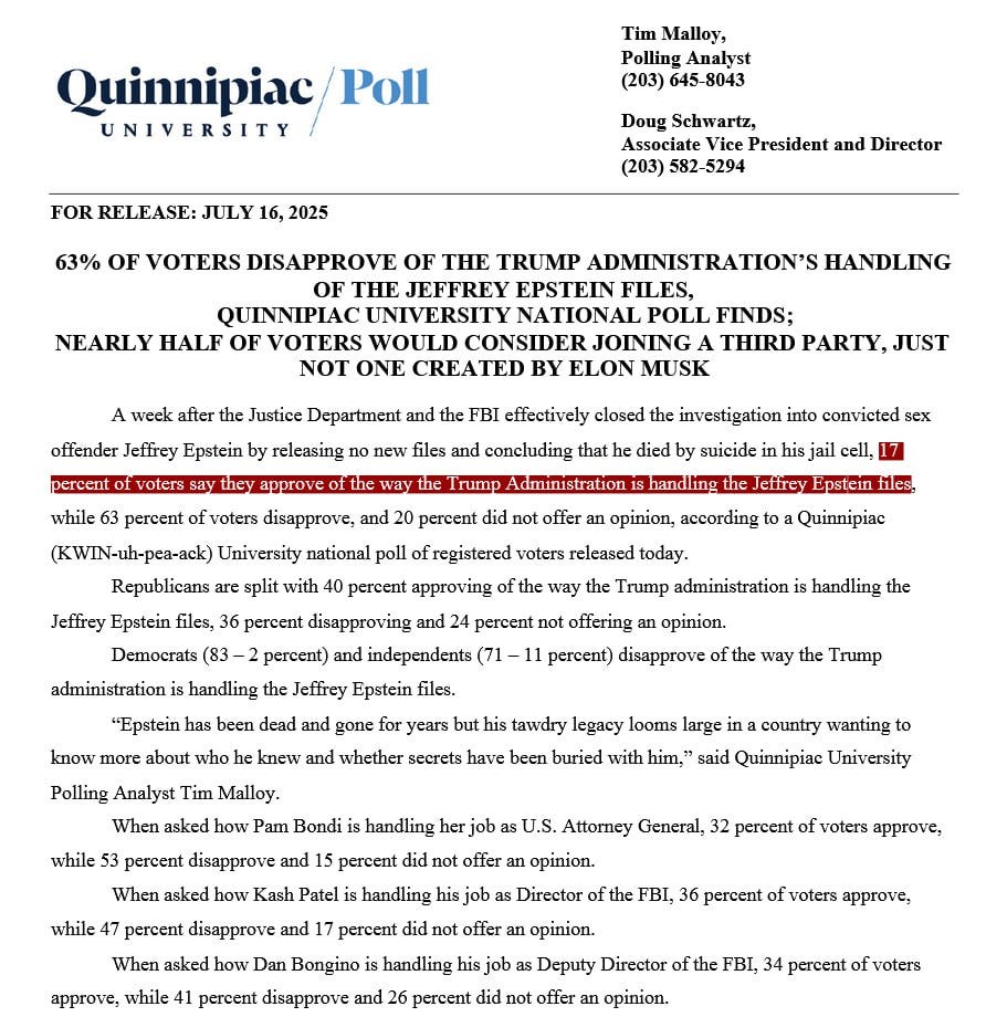Solo il 17% degli elettori afferma di approvare il modo in cui Trump sta gestendo il caso Epstein: sondaggio Quinnipiac.