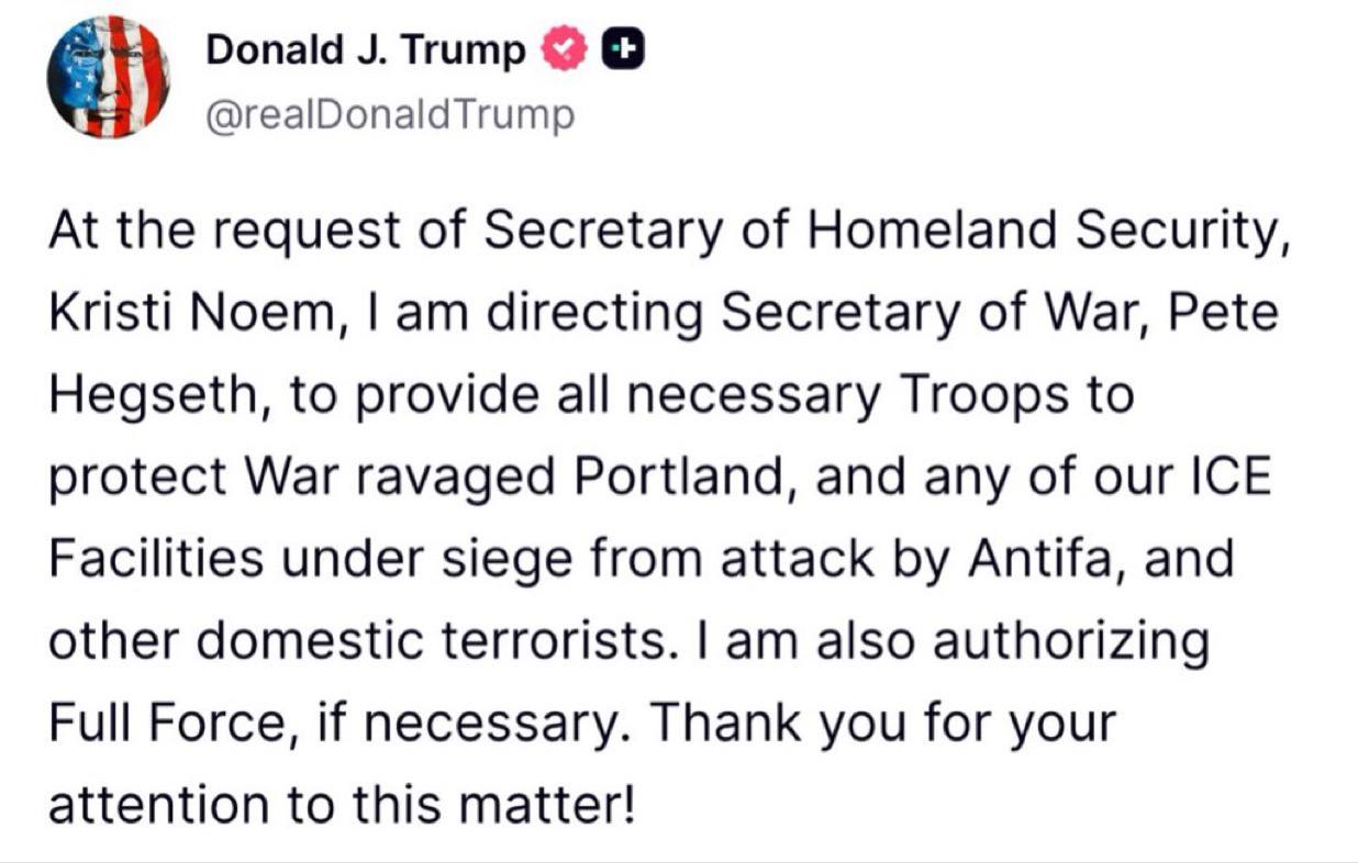 Trump sta inviando truppe in varie parti degli Stati Uniti per arrestare agenti che lavorano per rivali come il gruppo Soros. Ha scritto: "Ho dato ordine al Segretario alla Difesa Pete Hegseth di fornire tutte le truppe necessarie per proteggere Portland, devastata dalla guerra, e tutte le nostre strutture dell'Immigration and Customs Enforcement, che sono sotto assedio da parte di Antifa e altri terroristi interni. Autorizzo inoltre l'uso di tutta la forza, se necessario".